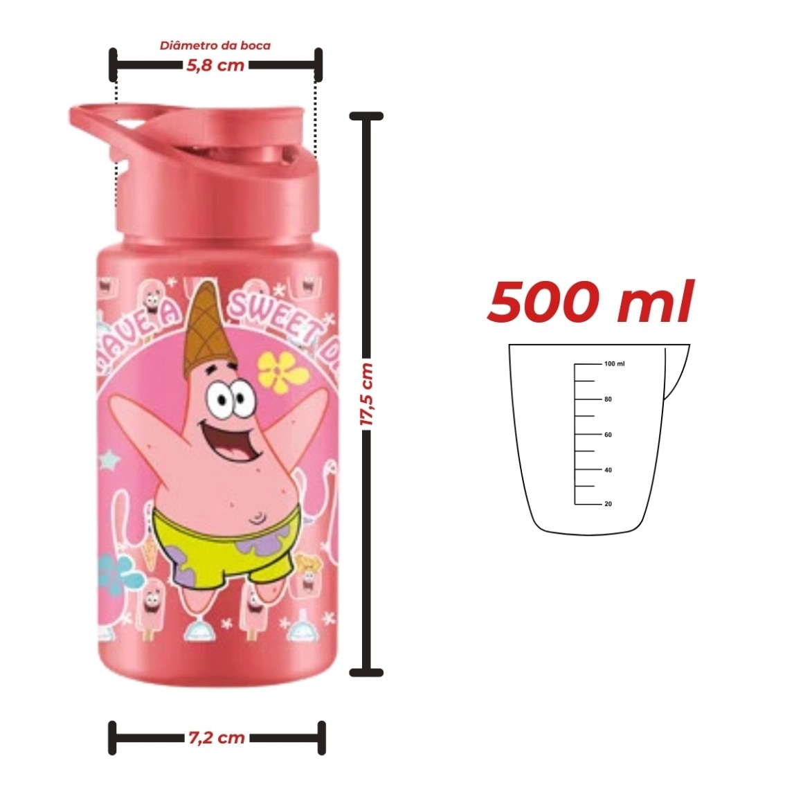 Com dimensões de 7,2 x 7,2 x 17,5 cm, o squeeze é compacto e fácil de transportar, cabendo perfeitamente em mochilas, bolsas e porta-copos. Seu design inspirado no personagem Patrick da Turma do Bob Esponja adiciona um toque de alegria e personalidade, tornando a hidratação uma experiência mais divertida.