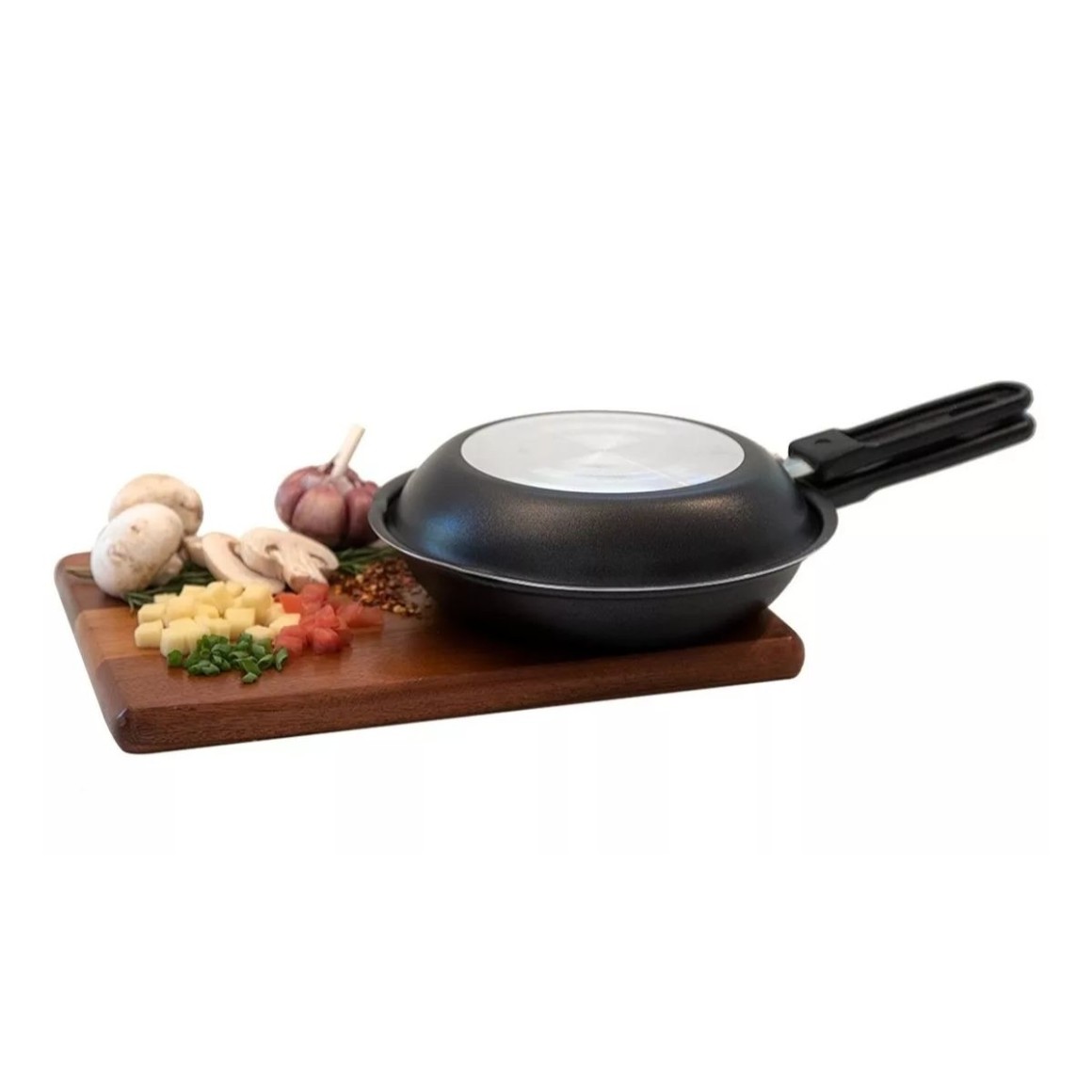- Estrutura: Composta por duas frigideiras que se conectam para virar alimentos com facilidade.