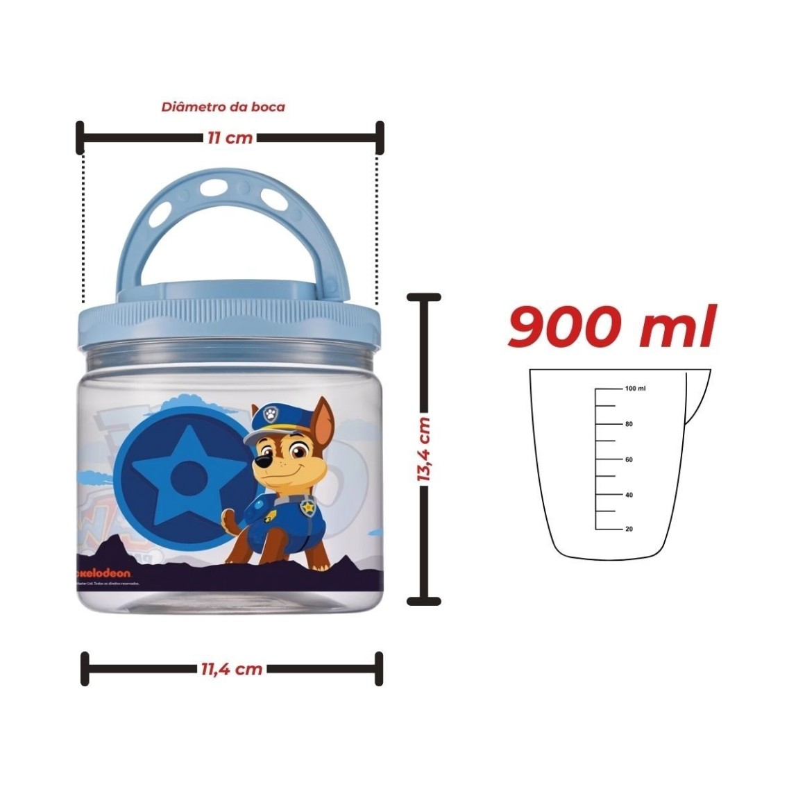 Descrição: Pote organizador com tampa azul e alça, decorado com o Chase. Ideal para armazenar uma maior quantidade de itens, com a conveniência da alça para transporte.